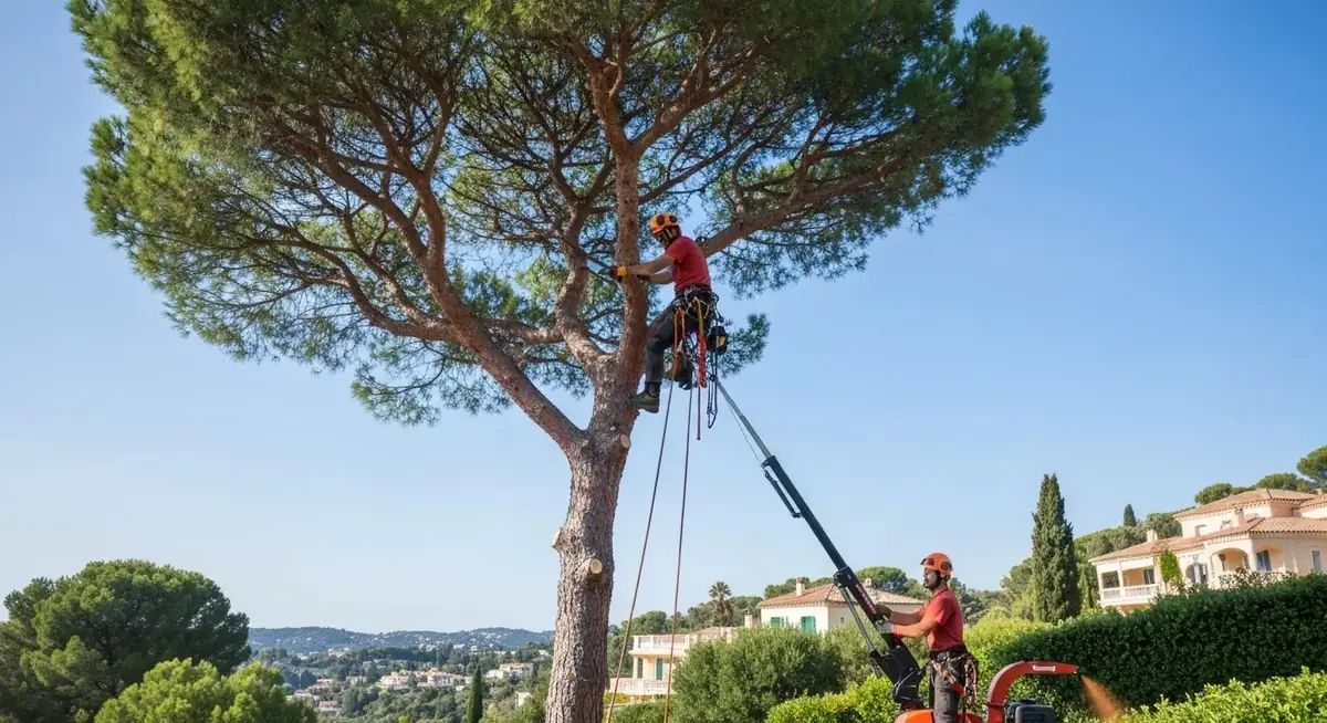 Olivierss, pins d'Alep, chênes verts, platanes, cyprès, amandiers — toutes les essences de la région. Grimpe encordée, nacelle, perche.